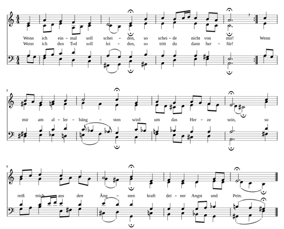 코랄 | Wenn ich einmal soll scheiden, So scheide nicht von mir! Wenn im den Tod soll leiden, So tritt du dann herfür! Wenn mir am allerbängsten Wird um das Herze sein, So reiß mich aus den Ängsten Kraft deiner Angst und Pein! |