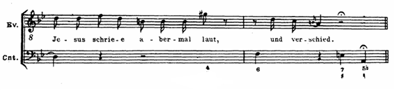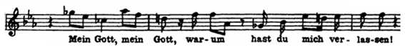그런데 그렇게 하려면 한 가지 문제에 부닥치게 됩니다. 아람어 원문의 문장과 독일어로 해석된 문장의 음절 수에 차이가 있기 때문입니다. 해당 구절의 아람어는 “Eli, Eli, lama asabthani”이며 독일어는 “Mein Gott, mein Gott, warum hast du mich verlassen?”입니다. 한눈에 보아도 아람어 원문보다 독일어 문장이 길고 음절이 많음을 알 수 있습니다. 그 격차를 해소하기 위해서 바흐는 음절 수가 적은 아람어 원문에 ‘라마’를 한 번 더 반복시킨 것입니다.